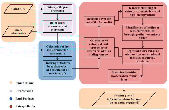 Our work aims to measure the information content of the RP distribution, implement a data-driven, non-parametric partitioning, provide a workflow for high-throughput data analysis and unbiased information extraction (Figure 1), and generalize the approach to various data types. We introduce the calculation of entropy over a transformation of the RP distribution, followed by a clustering procedure in order to identify the most consistent cutoff point successfully separating information-rich features from noise-dominated ones, without human intervention. The methodology operates upon the non-parametric RP distribution, relegating pfp and the p-value (which may be calculated empirically or parametrically) to quality indicators of the analysis instead of decision criteria. Consequently, it allows for improvement of the pfp calculation methods and adoption of new approaches [,], ensuring result reproducibility and comparability as long as the RP calculation process itself remains unchanged.