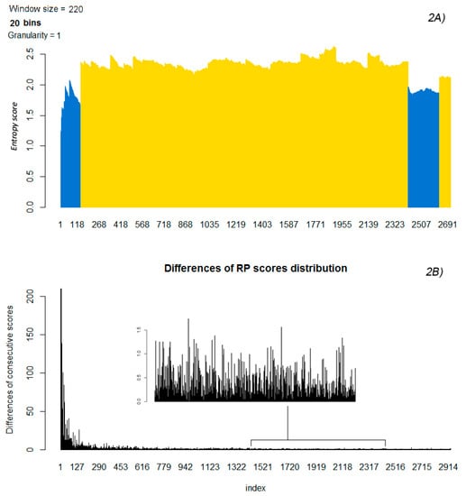 where and , as per the Bayes–Laplace uniform prior, reflecting our prior knowledge for the bin counts used during discretization [], with each bin having an equal a priori chance of accommodating a result. Figure 2A shows the resulting entropy score distribution for the GSE60767 gene expression data set. The initial, low-entropy area represents S. Subsequently, entropy rises sharply and oscillates around higher values, due to (small in absolute value, as seen in Figure 2B) stochastic oscillations of the RP differences. This pattern holds across different parameters of the sliding window and bin count, as well as across different data types, with consistency analogous to that of the RP distribution’s overall shape.