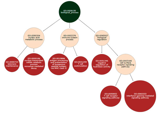 Using EnrichR, Jensen DISEASES identified rheumatoid arthritis as the most significant term by rank based ranking. Of particular note is the presence of allograft rejection terms at the top of the lists of both KEGG 2016 [] and WikiPathways 2016 [], pointing to the triggering of the same basic mechanisms in the course of the disease. BioInfoMiner mapping of the list onto Gene Ontology, Human Phenotype, MGI Mammalian and Reactome provides highly overlapping results. There is an overarching inflammatory response with terms specific to T-cell activation. Gene Ontology highlights the “telomere maintenance” (Figure 3) term, which has been an area of active study as to its implication in autoimmune syndromes [,,]. Furthermore, in the Human Phenotype ontology, highlighted terms include autoimmunity and rheumatoid arthritis. Lastly, the highly connected genes identified through BioInfoMiner for these four ontologies have a strong presence of the major histocompatibility complex family (HLA-C, HLA-DRB1, HLA-DQB1, HLA-DQA1, HLA-DRB1), a finding in agreement with one of the studies citing the data set []. Even with a reduced sample number, the proposed method extracted a biological signal highly relevant to the phenotype and in line with the findings of the original study for the full data set.