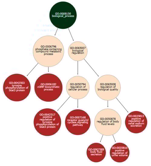 EnrichR was used to map the differentially expressed genes to Panther 2016 [], Jensen DISEASES and Reactome. Panther 2016 highlighted as the first term by combined ranking the Wnt signaling pathway, which has been implicated in cardiovascular syndromes []. Jensen DISEASES terms ranked first by combined score were “hypertension”, “coronary artery disease” and “cerebrovascular disease”. Reactome highlighted as the second term by combined ranking the Ca2+ pathway. Using BioInfoMiner to map the list onto Gene Ontology and Human Phenotype ontology showed terms related to thrombosis abnormalities, tyrosine phosphorylation of Stat3 protein, and the regulation of body fluid levels through the urinary system—the last of which is a known regulator mechanism of blood pressure (Figure 4). Lastly, the highly connected genes identified through BioInfoMiner are specifically associated with pharmaceuticals prescribed for cardiovascular conditions.