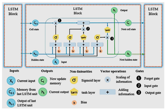 As depicted by Figure 1, a set of repeating block-chain facilitates effective learning of the time series information by the LSTM NN. The horizontal line (from to ) which runs from one block to another above the graph is called the cell state. Cell state runs across the blocks with slight linear interactions to ensure that constant state information is maintained [31]. Additionally, LSTM NN uses three different gates (see ❶, ❷, and ❸ in Figure 1). The gates use sigmoid and tanh layer, with a pointwise multiplication to allow for selective passing of information [32]. With the aid of the gates which act as a multi-level feature selector, LSTM NN can memorize or forget information. Other artificial NNs have a common challenge of long-term dependency problem.