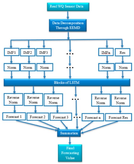 Given the above-mentioned importance of water quality monitoring [7,8,9], especially DO concentration for improved productivity in aquaculture, this paper proposes a hybrid prediction model to solve the challenge of poor DO concentration forecasting accuracy in aquaculture management. The hybrid model is designed by combining ensemble empirical mode decomposition (EEMD) technique with long short-term memory (LSTM) neural network (NN). The applied EEMD-based LSTM (long short-term memory) method allowed for the decomposition of the original sensor data into multiple intrinsic mode functions (IMFs), which are applied to improve DO concentration forecasting accuracy.