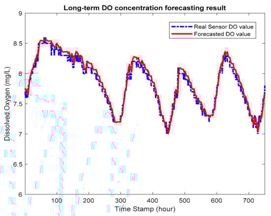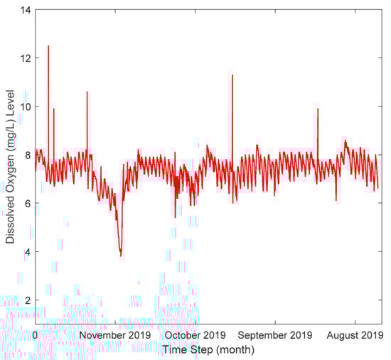 Water quality (WQ) is usually determined by the general composition of water in relation to its physical, biological, and chemical properties [1,2]. DO (dissolved oxygen) is one of the freshwater properties and undoubtedly one of the most important components for the survival of the aquatic life. DO concentration is an important WQ indicator of water pollution in the aquaculture ecosystem [3]. In the aquaculture farms, the required concentration of dissolved oxygen typically depends on the fish species and the water temperature. However, concentrations below 3 mg/L are related to stress in the aquatic species, increasing mortality and disease in most of the species. If this drop in DO concentration can be accurately forecasted, the aquaculture farmers can take early remediation actions to avert this catastrophe by increasing DO concentration, for example, through activating an aeration system [4,5].
