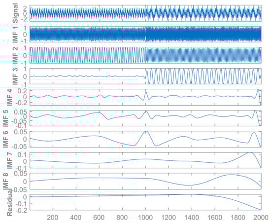 where and denote the total number of the IMFs components and the IMF, respectively; and represents the final residue.