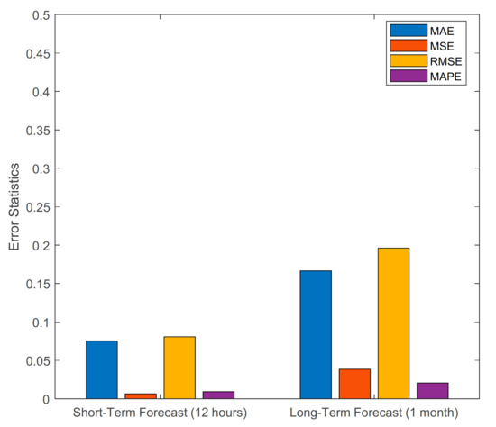 In Table 1, the error statistics for both short-term and long-term DO content forecasting performance of our proposed hybrid model are shown. The steep increase in error gap between the short-term and long-term DO content forecasting performance of our proposed hybrid model indicates that the nearer the forecast future the higher the forecast accuracy, and vice versa. Figure 9 shows the forecasting error statistics, using bar charts for both short-term and song-term DO concentration to further emphasize the increase in prediction error as the forecasting period increases.
