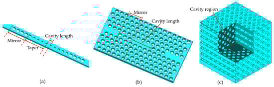 Schematics of (a) 1D, (b) 2D, and (c) 3D photonic crystal (PhC) cavities [37,38].