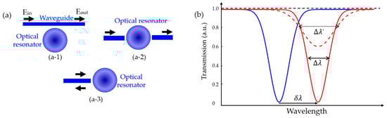 (a) Configurations of waveguide-resonator coupling: (a-1) waveguide (WG) side-coupled [88], (a-2) double side-coupled [89], and (a-3) single side-coupled [90]; (b) a characteristic dip at resonance wavelength for WG side-coupled cavity. The resonance shifts from blue line to red line due to perturbation, and a linewidth broadening Δλ′ − Δλ leads to a decreasing Q-factor [29].