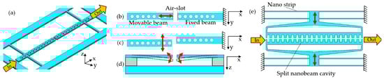 Mechanically tunable configuration can also be obtained via multi-coupled cavities by controlling the coupling strength between them. Taking a pair of PCN cavities coupled configuration in Figure 10a as an example, their coupling strength can be tuned by controlling the in-plane coupling gap to cause resonance shifts of even and odd modes. Such a configuration has attracted a lot of interests due to its potential for strong opto-mechanical interaction. Mechanically tunable coupled-PCN cavities could be modulated by the in-plane gap between two nanobeams (see Figure 10b) [49,50,51,52], in-plane laterally center offset (see Figure 10c) [53,54], out-of-plane rotation of suspended cavity (see Figure 10d) [55] as well as out-of-plane bending nanobeams (see Figure 10e) [56]. Du et al. [53] proposed a coupled PCN cavity by laterally driving a center-to-center offset to control the coupling strength dynamically, resulting in that optical mode splitting width decreased with the increment of lateral offset. Tian et al. [55] designed a torsion-induced coupled PCN cavity using a NEMS comb drive to demonstrate an optical spring effect with a maximum 77.1 Hz mechanical frequency drop by laser detuning. Besides, the out-of-plane coupled PCN cavity motion was presented using a vertical electrostatic force generated by tuning the potential difference between isolated layers [56]. With an applied voltage of 12 V, an out-of-plane displacement could cause a redshift of 40.5 pm in the second-order odd resonance mode and a blueshift of 63.5 pm in the second-order even resonance mode.