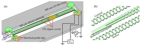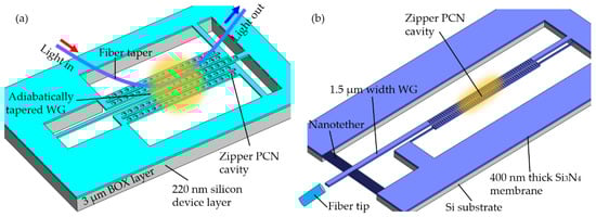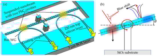 Nanobender cavity for displacement sensing: (a) nanobender cavity with waveguide-zipper PhC cavities coupling and electrical actuations; (b) close-up view on the zipper PhC cavities and waveguide coupling structure [96].