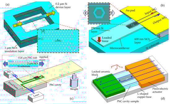 - Tung, B.T.; Dao, D.V.; Ikeda, T.; Kanamori, Y.; Hane, K.; Sugiyama, S. Longitudinal strain sensitive effect in a photonic crystal cavity. Procedia Eng. 2011, 25, 1357–1360. [Google Scholar] [CrossRef]