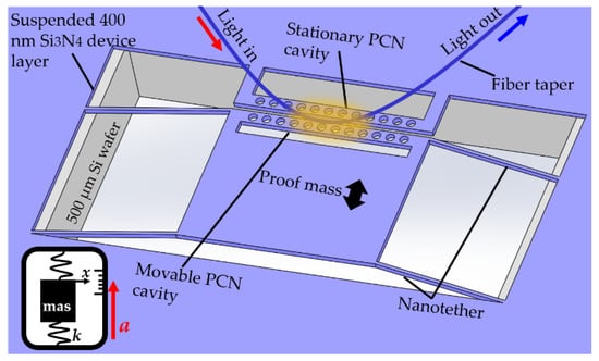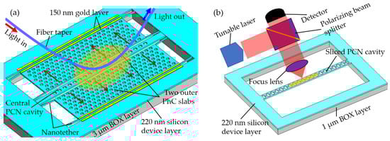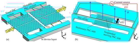 For opto-mechanical interaction-based sensing applications, mechanical displacement arising from perturbated factors can be converted into optical transmission signals. One of the general laws of electromagnetism to dynamically control photonic devices is achieved by displacing the dielectric boundaries, also known as mechanically tunable photonics [5]. It has been proved that both the mechanical displacement of dielectric boundary or variation of refractive index (RI) has a crucial effect on the cavity resonance, thus they can serve as a sensitive tool to measure mechanical factors [6]. Electrical actuation is widely implemented by exerting an electrostatic force to obtain moving boundaries or deforming structures, and it has led to the development of M/NOEMS integrated photonic devices. Current on-chip M/NOEMS for photonic integrated circuits (PICs) have many competing edges such as a small footprint, easy fabrication process and compatibility of integration with PIC integration [7]. For the purpose of sensing application, with the advantages of flexible mechanical configurations and integration with nano-/micro-electromechanical systems (N/MEMS), mechanically tunable photonic crystal (PhC) cavities have widely developed into a variety of sensors, such as displacement [8,9,10] and stress sensors [11,12], magnetic [13,14] and electric field [15] sensors. In addition, miniaturization of tunable photonics, which localizes light into sub-wavelength mode volumes in optomechanical resonators, has reinforced the interplay between photons and mechanics to an unprecedented level [16,17]. As light exerts forces, radiation pressure from the light reflected from an optical resonator can induce mechanical movement of device. This mechanical displacement, in turn, can change the optical modes of cavity and induce dynamically optomechanics phenomena. Unlike MOEMS tunable photonics under electrical driving, cavity optomechanics enables opto-mechanical interaction by the radiation pressure of light. Some milestone experiments have demonstrated, including ground-state cooling [18,19] and other quantum mechanical phenomena [17]. Understanding the behaviors of radiation force-driven interaction beyond the standard quantum limit [20], cavity optomechanics is also exploited in engineering metrology for fine control of nanophotonic optomechanical devices for sensing applications [21,22].