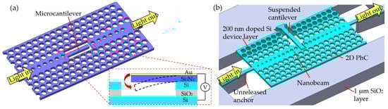 Out-of-plane deformation of 2D PhC cavity was also adopted for mechanical sensing applications. As shown in Figure 7a, a Si3N4 cantilever was embedded in the center defect of 2D PhC cavity [77]. The bending of cantilever modulated the effective RI, and hence induced resonance shift of cavity. A theoretical minimum of surface stress of about 0.8 mN/m was solved by mechanical tuning the defect of PhC slab. Another analogous tunable PhC cavity integrated cantilever was proposed by directly inserting a cantilever into the middle of a PhC nanobeam [78], as illustrated in Figure 7b. The top 200 nm silicon layer served as an electrode while the thick silicon layer acted as a ground, and these two layers were electrically isolated by a 1-μm silicon dioxide layer. The cantilever bent out of PhC slab and affected the band-edge resonance mode. Besides, a nonlinear behavior was observed in the impact of the cantilever’s deflection on resonance shift. A maximum resonant wavelength shift of 13.5 nm was obtained under the applied voltage of 97 V, however, the quality factor was relatively low because of the cavity loss caused by inserting the cantilever into the nanobeam cavity.