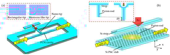 Schematics of the strain sensors: (a) double-layer PhC cavity using an atomic force microscope (AFM) tip contacting the center of microcavity to apply strain [12,102]; (b) displacement sensor using a double-membrane PhC slab integrated with electro-optical readout [10,103].