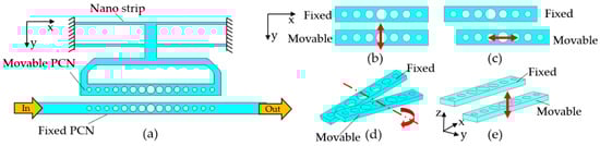 Schematics of mechanically tunable coupled PCN cavities: (a) doubly-coupled PCN cavity; (b) in-plane gap tuning [49,50,51,52]; (c) in-plane lateral center offset tuning [53,54]; (d) out-of-plane rotation [55]; (e) out-of-plane bending [56].