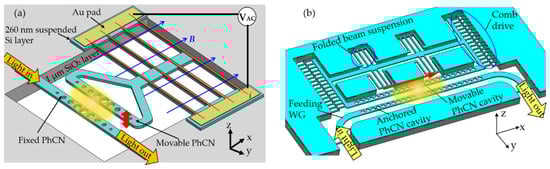 For sensing applications, a mechanically tunable coupled PCN cavity can also get its application in magnetic field sensing based on MEMS-actuated Lorentz force. As demonstrated in Figure 11a, a magnetometer was presented based on the resonance wavelength shift of a target supermode of the coupled PCN cavities. With the presence of magnetic field, the interaction between magnetic field and electric current in gold nano-wires could generate a Lorenz force to actuate a vertical offset variation between two coupled cavities. The resonance shift was caused by the Lorentz force-induced relative out-of-plane motion of movable nanobeam, thereby affecting the optical transmission [14]. The sensitivity and resolution were experimentally demonstrated as 22.9 mV/T and 48.1 μT/Hz1/2, respectively. Compared with other MEMS magnetometers, the proposed coupled PCN cavity sensor had a much smaller footprint. Thus, it could potentially achieve higher spatial sensing resolution of magnetic field. With an on-chip integrated NEMS actuator, another coupled PCN cavity was mechanically reconfigured in the lateral direction while keeping a constant separation gap [54], as shown in Figure 11b. By measuring the variation of resonance wavelength split width, the shearing optical force was detected at the scale sub-nano Newton (~0.29 nN). Such a lateral shearing optical force detection could be further studied in the applications of optomechanics and might be developed for optically driven tunable filters and optical switches.