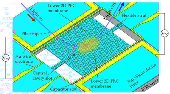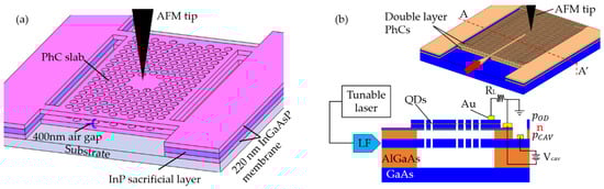 Similarly, 2D PhC cavities can also be vertically coupled [79] by electrostatically actuating the out-of-motion controlled separation gap between two cavities. As a result, a resonant wavelength split can be obtained with the variation of vertical coupling gap. For sensing application, a numerical study on the double-layered PhC cavity was investigated under applied stress induced by an atomic force microscope (AFM) tip [12,102], as shown in Figure 12a. Two InGaAsP PhC microcavities were vertically coupled with a 400-nm air gap, and their mode properties and optical spectrum response were modulated when this gap varied with the structural bending of PhC cavity. The detectable stress limit was estimated to be as small as 0.95 nN with an air gap of 165 nm in the presence of point AFM force. Experimentally, an on-chip displacement sensor was realized based on the double-membrane PhC slab integrated with electro-optical readout, as presented in Figure 12b [10,103]. The performance of the proposed displacement sensor was also characterized by nanomechanical actuation using a commercial AFM tip. It was demonstrated that the sensor had a sensitivity of 0.17 nm/nm (wavelength/displacement) and a displacement noise floor of 7 fm/.