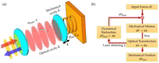 The starting point of subsequent radiation pressure-driven opto-mechanical interaction is briefly referred to cavity optomechanics. Radiation pressures, also known as optical forces, become obvious in the presence of strong gradients of optical mode field confined within nanomechanical holes or slots [17]. Here we take a model based on F-P cavity to discuss optomechanical phenomena, as illustrated in Figure 13a. In the optomechanical system, light with frequency is confined inside a high Q-factor optical cavity. Meanwhile, one of the mirrors of optical cavity with the effective mass is coupled with a mechanical oscillator represented with a spring constant k = 2. The mechanical oscillator with its mechanical quality factor vibrates at its mechanical frequency . The motion x of mechanical oscillator brings about a variation in the optical path length to alter cavity resonance , which in turn causes a change of light amplitude, thereby varying the radiation pressure acting on the motion to close this optomechanical backaction. We refer to this feedback-loop backaction as dynamic backaction, as presented in Figure 13b. In this feedback-loop, it starts with a mechanical oscillator subject to an input force dF (thermal forces or applied signal forces) to drive a mechanical movement x. Due to the optomechanical coupling , mechanical movement tunes optical cavity field dα, wherein contains information on the mechanical position. Besides, the amplitude fluctuation dα is also coupled back to the mechanical oscillator via laser detuning, resulting in a backaction. Finally, the light amplitude change-induced radiation pressure takes effect on the mechanical oscillator, closing the feedback loop.