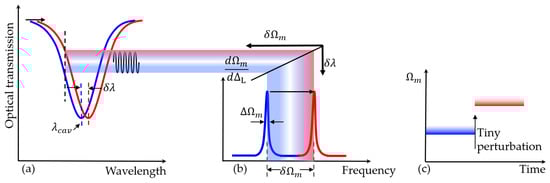 Schematic illustrating optical spring sensing mechanism [108]: (a) optical transmission spectrum; (b,c) mechanical spectra shift due to the applied tiny perturbation.