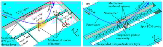 When two PCN cavities are placed close to each other and their mode fields are coupled together, resonant frequencies of coupled supermodes can be adjusted by controlling the coupling strength between two cavities. In mechanically tunable coupled PCN configurations, under the applied electrostatic force of N/MEMS actuation, physical displacement of moveable PCN cavity could be modulated in-plane gap between two nanobeams [49,50,51,52], in-plane laterally center offset [53,54], out-of-plane rotation of suspended cavity [55] as well as out-of-plane bending nanobeams [56]. In a similar method, a vertically coupled PCN cavity [57] was electrostatically controlled. With two PCNs etched on two vertically coupled GaAs flexible nanobeams, a large wavelength tuning range over 12 nm was achieved through a bias voltage 15V. Moreover, triple-coupled PCN cavities [58,59] with a Q-factor reaching up to 8 × 104 have been reported. By precisely controlling the position of cavity vertically and horizontally, a 41.69-pm wavelength tuning of resonance and small degradation of Q-factor were obtained [59]. Coupled resonant system with high Q-factor and high transmission opened interesting perspectives in nonlinear optics and signal processing. In the radiation pressure-driven systems, two laterally coupled PCN cavities [44,60] could support propagating waveguide modes and achieve a large coupling strength to GHz mechanical resonators in the Si3N4 PCN cavity. More importantly, a flexible design of mechanical resonator could greatly vary mechanical stiffness and frequency, in turn, resulting in stronger optomechanical coupling strength. Another laterally coupled PCNs [45,61,62,63] also called zipper cavity, were designed and fabricated with resonator mass of pg order of magnitude. Consequently, a combination of decreasing mechanical loss at the mechanical frequency and reduced effective motion mass (10 pg to 50 fg) resulted in a dramatically enhanced force sensitivity of optomechanical system. In the zipper nanobeams, an optical force-induced spring effect was observed through mechanical frequency shift and linewidth variation. From the perspectives of engineering applications, zipper nanobeam paved the way for wide-bandwidth optical frequency conversion and filtering induced by optical forces. Besides, a vertically coupled PCN cavity [64] was demonstrated with a lower motion mass, and a comparable optical Q-factor and mode volume, resulting in larger zero-point fluctuations of mechanical modes and larger photon–phonon coupling rates.