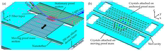 Mechanically tunable 2D PhC cavities could also be achieved by varying the air-slot distance, which has been developed for displacement sensing. Yang et al. [9] theoretically demonstrated a micro-displacement sensor with a fixed and moving hole-array based slot PhC cavity, as shown in Figure 6a. The tuning of high-Q cavity was formed by laterally shifting two adjacent holes outwards in the opposite direction. It demonstrated a quasi-linear measurement of displacement with a sensitivity of 1.0 a−1 in simulation results. In a similar manner, Figure 6b demonstrated a magnetometer based on an on-chip scale slot PhC cavity with movable and fixed sections [13]. An air-slot was inserted in a planar photonic crystal slab and high Q factors were attained by designing the dimensions of the air holes near the cavity center. As the movable mass of optical cavity assembly was affected by the magnetic field to displace the movable mass and change the width of air-slot, the alteration of the width of air-slot can be detect through the optical resonance. With an in-plane displacement sensitivity of 1.0 pm/Hz1/2, the enhanced magnetic sensitivity of 11.4 nT/Hz1/2 was achieved.