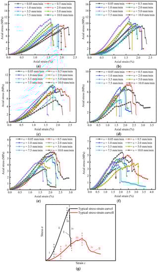 3.1. Effect of Loading Rate and Inclination Angle on the Axial Stress–Strain Curve