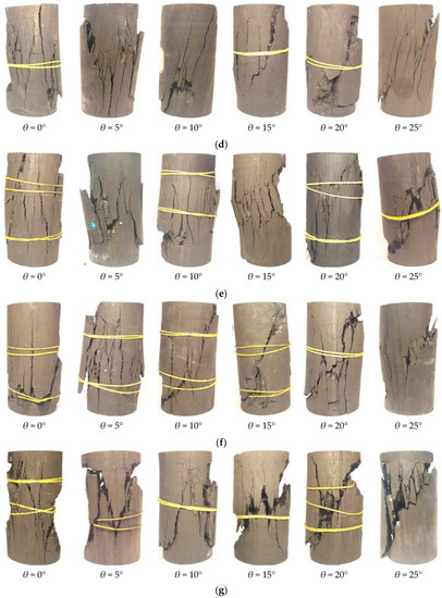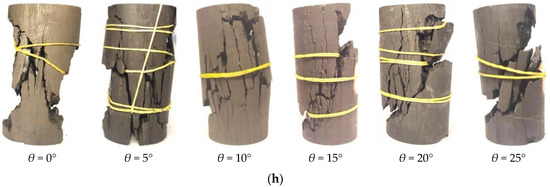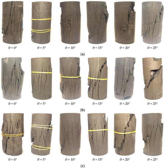 | 10 | Splitting cracks approximately parallel to the axial direction of the samples are generated on the surface of most coal samples, accompanied by a large number of shear cracks. Axial splitting is transformed into shear slipping failure | Tension–shear composite failure | |