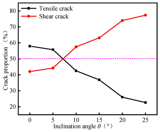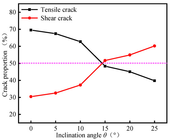 | Inclination Angle (°) | Tensile Crack/Total Crack (%) | Shear Crack/Total Crack (%) |