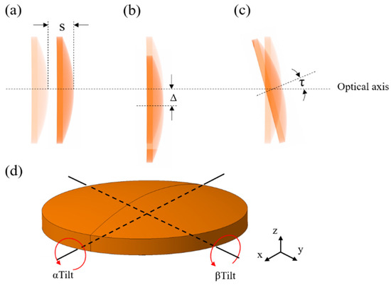 Undesired mis-alignments cause the degradation of image resolution, which consists of independent parameters in three-dimensional cartesian space (i.e., De-space, De-center, and Tilt), as shown in Figure 1. De-space represents the undesired deformation of the secondary mirror that occurs parallel to the direction of the optical axis. De-center indicates an undesired lateral displacement perpendicular to the optical axis, and Tilt indicates an irregular angle or skews relative to the optical axis, measured as rotation about axes perpendicular to the optical axis.