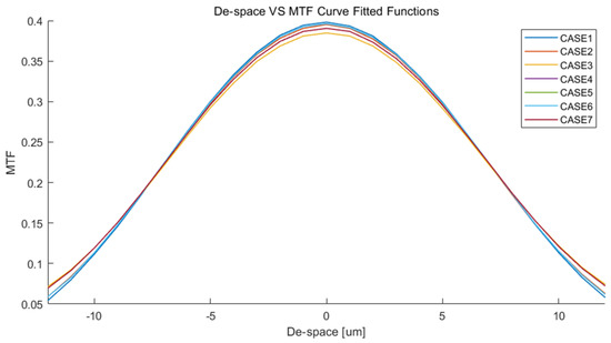 When α and β-Tilts were 200 µrad (Case 3), respectively, the MTF was reduced by 5%, compared to Case 1 (without Tilts), as shown in Figure 2. On the other hand, once the De-space was over ±5 µm, the MTF degraded to below 30%, where the MTF value was a minimum. Furthermore, the degradation of MTF due to De-space is more significant than the degradation caused by Tilt. Therefore, the De-space and α and β-Tilts should be limited by ±5 µm and 200 µrad, respectively. Also, the available range of MTF should be over 30%, which is the minimum value that would allow the optical system to produce a high-resolution image.