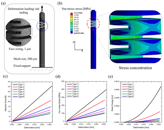 Figure 4. Static simulation results of the flexure hinge; (a) Simulation setup, (b) Distribution of the Von-mises stress along with the flexure hinge and stress concentration on each slit; the plotted graphs of (c) Reaction force at the fixed support versus deformation, (d) Von-mises stress versus deformation, and (e) Strain energy versus deformation.