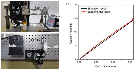 Based on the criteria established through the simulation results, the FlexHe was fabricated and experimentally investigated. As shown in Figure 6a,b, the extension test for a single FlexHe was performed by using a Micro stage with a LVDT sensor, and the reaction force was obtained by using a load cell (Dacell, CB1, South Korea). As per the plotted graph in Figure 6c, the obtained reaction force at a deformation of 23.5 µm was 11.05 N, and the error rate was 4.03% with respect to the simulation result (10.62 N). The relation of the reaction force versus strain showed a linear behavior, and the deformation followed the elastic region of the structure. For a single FlexHe, hysteresis was not observed in both of the experimental and simulation results.
