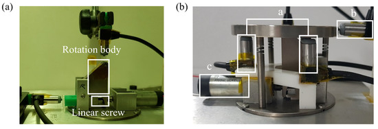 where F is the required force of the linear screw to push the rotation body, dm is the diameter of the linear screw, f is the friction coefficient, and l is the pitch of the linear screw, respectively. The required torques for the loading and unloading were identified as 28.8 mN·m and 20.6 mN·m, respectively. The geared motor (Maxon Motor®, A-Max 16, customized, Sachseln, Switzerland) with a maximum torque of 230 mN·m was employed by using a safety factor of 8. Also, the employed encoder provides 512 PPR (Pulses/Rev) of resolution; thereby, the system provides the resolution up to 55,296 PPR. Accordingly, considering the pitch of the linear screw (0.5 mm) and the system resolution, the geared motor can be controlled by 0.01 µm, theoretically. However, we observed the undesired error (±5 PPR) during the position control, and thus, the controllable resolution for producing the De-space was determined to 0.1 µm. Therefore, the embedded DC geared motor with the encoder can minimize the error rate of De-space and enables highly precise control of the MTF at increments of 0.22%.