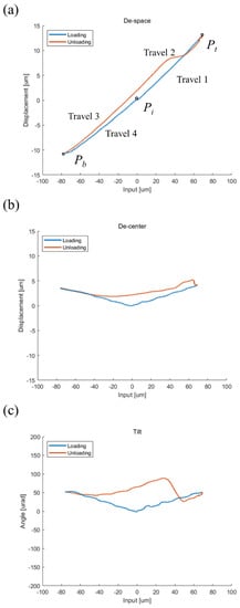 As shown in Figure 9a, the De-space can range from −10.93 to 13 µm with a hysteresis of 10.46%, and the maximum error for loading and unloading was 2.47 µm. The loading and the unloading cycles were characterized by means of 5th polynomial fitting, in order to avoid the possible errors between the desired and the current De-space due to the hysteresis. As summarized in Table 6, the agreement between the interpolated curve and the experimental curve was very good, with R-square of 99.99%. In the case of De-center, its distribution can range from 0 to 5.2 µm, and the hysteresis was 41.60% (Figure 9b). Conversely, Tilt showed a relatively large hysteresis of 73.63%, yet its response achieved the range of between 0 to 88.45 µrad (Figure 9c).