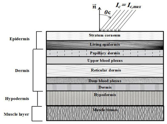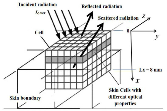 In this section, human skin with and without malignancies is numerically studied after having been exposed to a low-power short-pulse (ultrafast) laser (Figure 1 and Figure 2). The incident laser pulse Ic(t) obeys Equation (4), and the same thicknesses for both layers (i.e., the epidermis and the dermis) are used as those by Wang et al. [30] and Bhowmik et al. [21]. The thicknesses of the hypodermis (the subcutaneous) and muscular layers and their refractive indices, n, are obtained from the works of Bhowmik et al. [21] and Bashkatov et al. [27,28]. Thus, the total thickness in the collimated x-direction of the human skin layers is 8.0 mm. In our study, three-dimensional skin layers, with dimensions 8 × 100 × 100 mm3, are simulated. The total optical thickness at a wavelength of 785 nm (Table 2) is obtained from its integration along the total thickness of the skin as follows [21]: