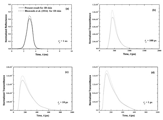 In this section, the influence of the pulse width tp on the normalized reflectance and the transmittance for normal human skin is analyzed according to the properties described below as well as without malignancies (Figure 4 and Figure 5). Four pulse widths are considered for a single pulse: tp = 1 ns, 100 ps, 10 ps and 1 ps. In addition, signals reported by Bhowmik et al. [21] are plotted for a one-dimensional case so that we may compare our present three-dimensional results using the FTn FVM to those given by the discrete ordinates method utilized in [21]. In order to analyze the signals properly, we depict the results using the CLAM scheme only. In fact, for fine spatial grids, the results obtained using the STEP scheme, which are not shown here, closely match those reported using the CLAM scheme.