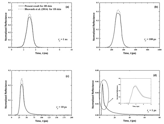 Figure 4 and Figure 5 show that the results of both normalized transmittance and reflectance reproduce the incident ultrafast laser, although their peak magnitudes are different. Also, the present three-dimensional signals have the same shapes as those for the one-dimensional case of [21]. For the same pulse width, the transmittance is greatly decreased (Figure 4) by comparison to the reflectance (Figure 5). In fact, for tp = 1 ns, the peak values of the normalized transmittance and reflectance are 1.8 × 10−2 and 0.41, respectively. It is shown that the decrease of the pulse width decreases the peak magnitude of the transmittance signals (Figure 4). This can be explained by the fact that large pulse widths require more thermal energy (heat) input to the skin, thus creating the trend obtained at higher peak amplitudes for a larger pulse width. Both peak magnitudes and temporal differences of the reflectance are small for the lower value of tp (Figure 5). The cascading effect becomes visible only for the lowest laser pulse width (i.e., tp = 1 ps) (Figure 5). The consecutive augmentation in the reflectance’s peak magnitude is more important for tp = 1 ps.
