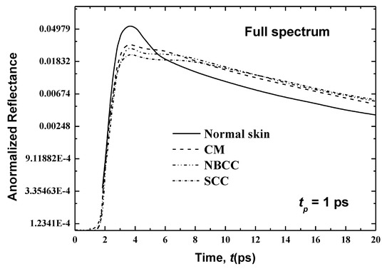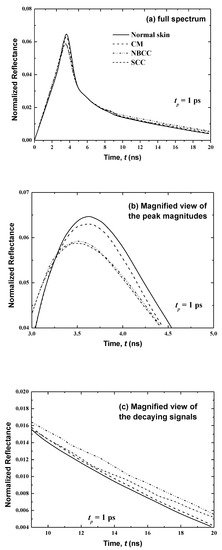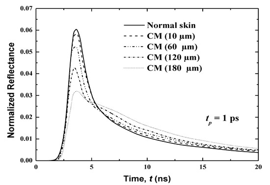 Figure 6 presents temporal variations in the reflectance at x = 0 for the first case where the cancer is developed only in the basal layer (thickness: 10 μm) in consideration of the three main types of malignancies (i.e., cutaneous melanoma (CM), nodular basal cell carcinoma (NBCC) and squamous cell carcinoma (SCC)). These skin malignancies differ in their optical properties, as tabulated in Table 3. Figure 6 shows that, for normal skin, the peak magnitude of the reflectance is obtained at time t = 3.85 ps. However, the peak of magnitudes in the existence of CM, NBCC and SCC malignancies in the basal layer manifest a little ahead of the normal tissue (at 0.06, 0.15 and 0.17 ps, respectively). In addition, these peak magnitudes of reflectance are less than that of the normal skin. By comparison to the last peak magnitude cited for the normal skin, the differences are 0.00154, 0.0016 and 0.002 for CM, NBCC and SCC, respectively (Figure 6).