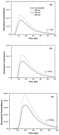 Figure 8 and Figure 9 show the temporal transmittance and reflectance signals from normal skin subjected to a laser at these three different wavelengths and three laser pulse widths. The increase of the laser wavelength decreases the magnitudes of these two signals due to the decrease in the optical thickness of skin when the laser wavelength varies from λ = 840 nm to λ = 785 nm.
