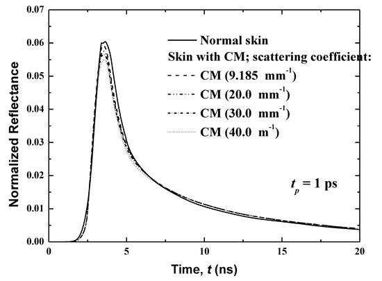 Figure 11 shows the effect of the scattering coefficient of the malignancy on the temporal reflectance profiles from human skin with CM spears in the basal layer. In the present work, four different coefficients are considered: 9.185 (the same value as the previous case), 20.00, 30.00 and 40.00 mm−1. It is notable that because this layer is entirely full of this of this malignancy, the CM malignancy and basal layer have the same .