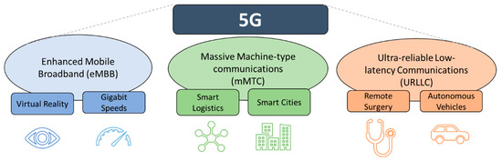 The future of mobility includes autonomous driving [6,7]. A car can be viewed as a robot that uses sensors and communications to interact with the environment, generating a large amount of data and using artificial intelligence to make decisions. Fifth generation (5G) communications play an important key in autonomous driving, using ultra-reliable low-latency communications (URLLC) [8]. As can be observed in Figure 2, URLLC was designed to support new services, such as remote surgery or autonomous vehicles, which are delay-sensitive services that require very low bit error rates (errors being almost unacceptable). 5G communications support vehicle-to-vehicle (V2V) communications without making use of a base station. Point-to-point communications are also considered in other 5G services.