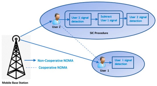 Due to the near–far problem and power control, the transmission power of different users suffers variations. By employing successive interference cancellation (SIC) and detecting users’ signals in descending order, NOMA can detect different users that share the same time and frequency. Two different types of NOMA exist: conventional NOMA and cooperative NOMA. As can be viewed in Figure 5 with conventional NOMA, the SIC of a reference user only detects, regenerates, and cancels users’ signals with powers higher than the reference user. Therefore, those user signals closer to the base station (with less power, due to power control) are not cancelled, representing interference, and degrading the performance (see User 1 in Figure 5). On the other hand, cooperative NOMA allows the cancellation of all interfering users’ signals and provides diversity. Cooperative NOMA considers that users closer to the base station, that have previously detected and subtracted more powerful users (farther from the base station), send over the air copies of signals of said more powerful users. Let us focus on the example depicted in Figure 5. User 2, the user closer to the base station (strong user, due to stronger channel conditions), using SIC, detects User 1 first (a weak user, i.e., a more powerful user) and subtracts this signal from the received signal before detecting its own signal (User 2′s signal). Assuming cooperative NOMA, User 2 sends over the air the previously detected signal of User 1. While with conventional NOMA User 1′s signal detection would be corrupted by User 2′s signal (less powerful and therefore not detected by SIC), with cooperative NOMA, User 1 also receives the copy of its signal sent by User 2, and then employs an efficient algorithm to combine the two versions of User 1′s signal. Note that the version of User 1′s signal detected by User 2 should be subject to the cancellation of User 2′s signal before it is transmitted. This is an action that allows such a copy of User 1′s signal to be clean of interference. Therefore, cooperative NOMA brings special added value for users that are farther from the base station) i.e., those with higher powers).