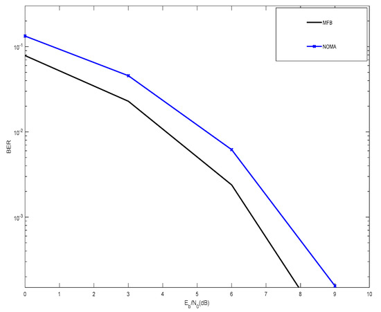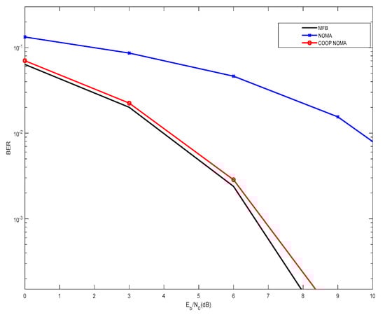 Cooperative NOMA comprises the detection of other users with SIC on the receiver of the interfering users (closer to the base station and, therefore, with lower power). Therefore, the interfering signals associated with all users are cancelled. The power of User 2 (seen by User 1 as an interfering user) is higher than that of User 1, being detected, regenerated, and cancelled using SIC to allow the detection of the data sent to User 2. Cooperative NOMA considers that User 2 retransmits the symbols detected by SIC (typically using time-division multiplexing). These two signals are combined to improve performance. In Figure 6, we can see that the combination of signals performed with cooperative NOMA results in a high level of performance improvement, as compared with conventional NOMA. In fact, the performance of cooperative NOMA is very close to the MFB.