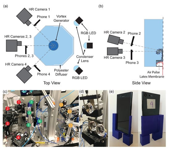 (a) Top view sketch of the experimental setup showing the positioning of smartphones, high-resolution (HR) cameras, and LED back-lighting around an octagonal tank. (b) Side-view sketch showing the vertical positioning of the central cameras and a cross-section of the vortex generator at the tank centerline. (c) Photograph of experimental setup. HR Red Cinema cameras are labeled with red circles, while the Xperia smartphones are labeled with green circles and the LED clusters are labeled with orange circles. (d) Close-up detailed photograph of an RGB LED cluster with lenses. (e) Detail photographs of the custom, in-house 3D printed smartphone holder to stiffly mount the smartphones via aluminum struts to the optical table.
