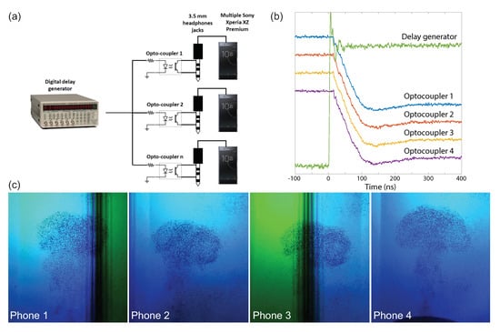 In our prior work [], we used a WiFi router to synchronize and trigger all of the smartphones followed by a long exposure time. Thus, the color flashes were able to “freeze” the same instant in all of the cameras. In contrast, recording at 960 fps results in a captured frame every 1.04 ms, which is faster than the typical response time achieved by the WiFi router used in the earlier study. To overcome this difficulty, we use the phone’s capability of triggering the camera with the pins present on the 3.5 mm audio jack by creating a short circuit between the GND and MIC pins. In our experiments, we use high-performance optocouplers (Fisher model 6N136-1443B) in parallel as relay switches between a TTL signal from a digital delay generator and an electrical input to the smartphones, which provides sufficiently fast temporal response as compared to a mechanical relay. Figure 2a shows a schematic of how the optocouplers are wired to the phones and connected to the delay generator. The time response characteristics are also essential for our high-speed application. Therefore, a test using the digital delay generator to check the response time of the optocoupler was carried out using a digital oscilloscope.
