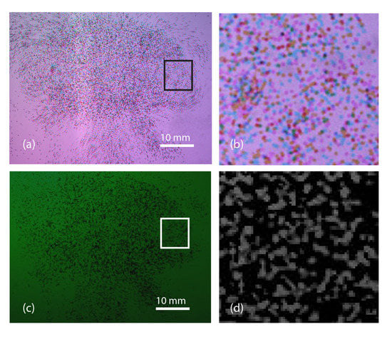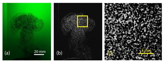 Figure 3 shows a typical image captured in the high-speed video mode. Here we can clearly see the vortex ring structure seeded with the black particles forming a “mushroom” shape (see Supplementary Video S1, here we can observe a recording at 960 fps of the vortex ring traveling upwards). The average density of particles inside the seeded region is 0.08 particles per pixel (ppp). The source density or fraction of the image occupied by particles is 0.5 for these experiments. Each particle is approximately 2 pixels in diameter. The maximum particle displacement between frames in the fastest regions is approximately 5 pixels near the vortex core. The non-uniform background (see Figure 3a) requires some image pre-processing to feed cleaner images to the DaVis software. We split the channels of the captured images, and only the green channel is processed. The open-source package, “Fiji”, is used to process the images and the “subtract background” command is used for this purpose. This command employs the “rolling ball” algorithm proposed by Sternberg []. A rolling ball radius of 20 pixels is used and smoothing is disabled to avoid blurring out individual particles. After removing the background, the images are inverted and enhanced by normalizing each frame by its maximum pixel value. Final images exhibit bright particles in a dark background as is required for the DaVis software (see Figure 3b,c). The captured images have a large pixel size of approximately 150 μm/px while our particles are approximately 200 μm in diameter.