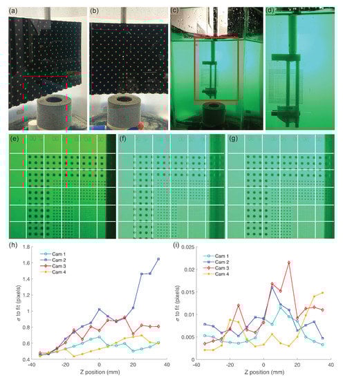 (a,b) Smartphone images captured in the manual mode for the calibration plate at mm by (a) left camera, phone 1, and (b) central bottom camera, phone 3. The gray cylinder at the bottom is the vortex ring generator. (c,d) Top central camera, phone 2, view of a dotted calibration target located at the central plane of the vortex ring. (c) Captured with manual settings at 19 Mpx resolution. (d) Image of binned image from 19 Mpx resolution and centered cropped to pixels (see the red region in (c)). (e–g) Region of Interest (ROI) zoom ( pixels) from the dotted calibration target. (e) High-speed video recording mode, (f) centered binning of with top left corner located at and px (centered down-scaled image) (g) Binning of with top left corner located in and px of the binned image. A rectangular grid is shown for comparison. (h) Initial standard deviation of the calibration fit. (i) Final calibration standard deviation after three iterations of the self-calibration algorithm.