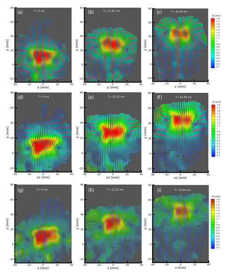 (a–c) Two dimensional cuts through the center of the vortex ring, showing the instantaneous velocity field. (d–f) Two dimensional vertical cut of the instantaneous velocity field in a 45-degree plane. (g–i) Two-dimensional cut of the instantaneous velocity field at the center of the vortex ring (note that this plane is not directly visible and is perpendicular to the central camera sensors). Different times are plotted from left to right (0, 22.92 and 45.84 ms respectively, showing the upward translation of the vortex ring). Vectors are colored by their velocity magnitude.