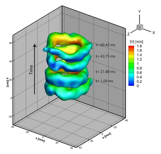 The following are available online at https://www.mdpi.com/2076-3417/10/20/7094/s1, Video S1: This supplemental video shows a 960 fps recording of the vortex ring seeded with black particles from the top camera (Camera 2). Video S2: This supplemental video shows an animation of velocity vectors and isosurfaces of vorticity with vorticity magnitude = 220 s−1 calculated from the measured velocity fields through time.