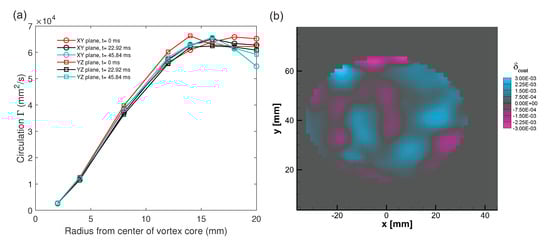 Figure 7a shows calculated values of on the and planes at three different times. As the radius from the vortex core increases, the circulation approaches a constant maximum of mm2/s irrespective of the plane. Below a radius of 16 mm, the circulation is nearly constant in space and time. Above 16 mm, the circulation is also nearly constant, but there is more variation in space and time. In all, the circulation is conserved supporting the consistency of the calculated velocity fields. We also estimate the Reynolds number of the vortex ring, . Using the maximum circulation around the vortex core results in 16,500.