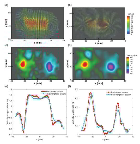 We compare qualitatively the planar velocity fields in Figure 9a,b and the out-of-plane azimuthal vorticity in Figure 9c,d in the central plane. The main qualitative features such as the location of the vortex core, velocity, and vorticity magnitude are comparable for both systems. However, the relatively lower resolution in the case of the smartphones is evident from this figure. Further comparison is carried out at a horizontal line (at y = 44 mm) that cuts one side of the vortex core (since the vortex core is not completely horizontal). Despite the high-velocity gradients in the area, Figure 9e shows close similarity between the velocity profiles reconstructed by the two independent systems. Figure 9f shows similar results for the isovorticity magnitude values along the same line. We highlight that the largest errors are due to slight offsets in the vortex core location combined with the strong velocity gradients close to the outer edge of the cores.